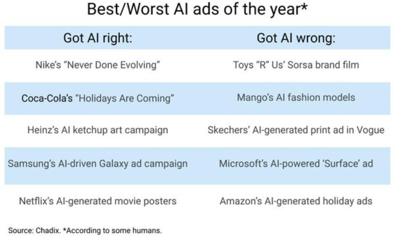[MediaPosts’s Best/Worst AI Ads] https://www.mediapost.com/publications/article/403413/bestworst-ai-ads-according-to-some-humans.html?utm_source=newsletter&utm_medium=email&utm_content=readmore&utm_campaign=137708&hashid=A5fZvpGdRfyWgET8vOfczQ