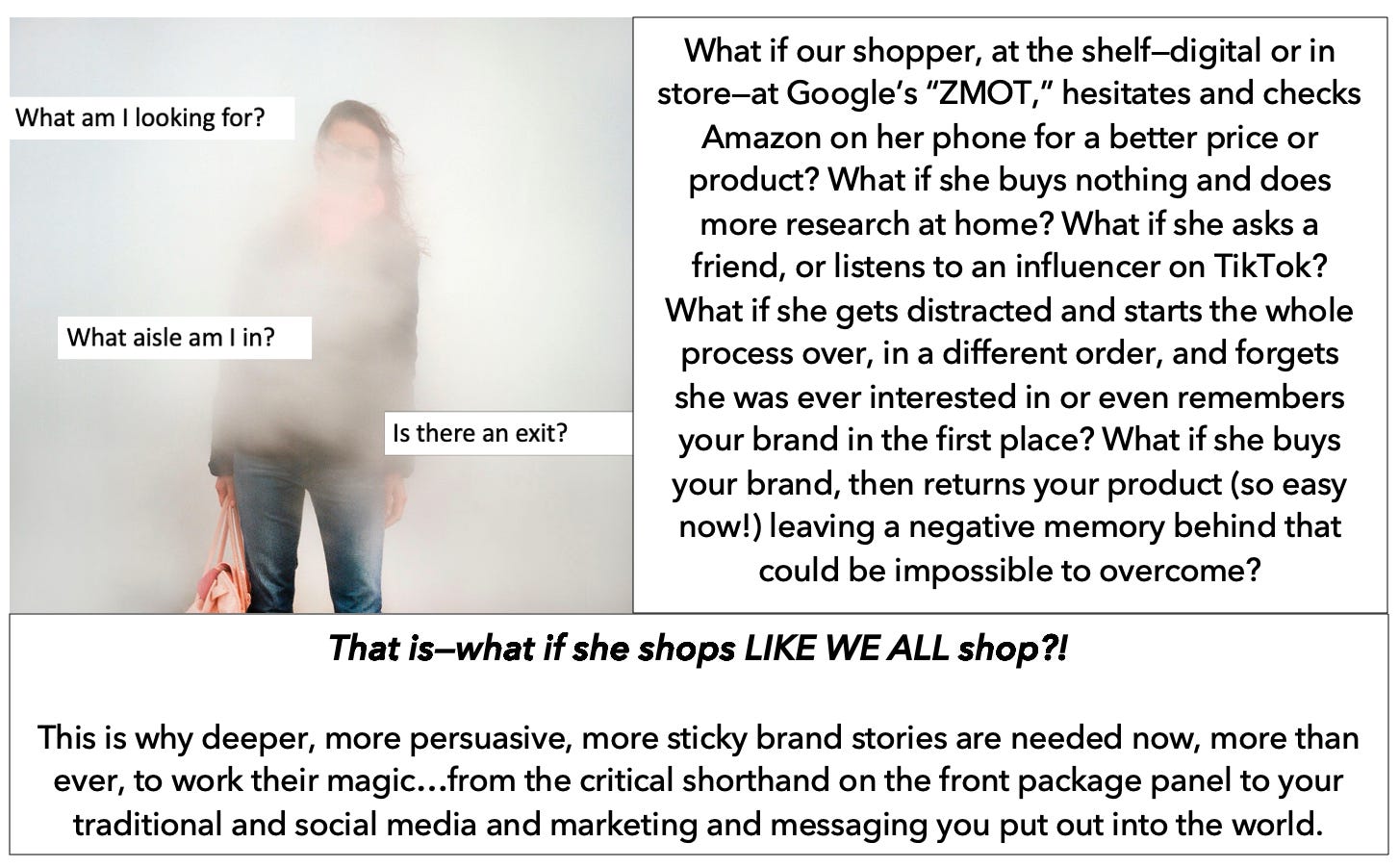 Here’s how I blocked out a product decision path for a client recently, and the importance of compelling brand storytelling. I included a mention of my friend Jim Lecinski’s “ZMOT” thesis from 2011—that “Zero Moment Of Truth” when we’re at the shelf, in a store or online, making that final purchase decision…or not.